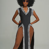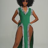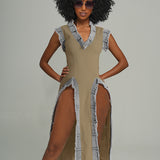 Denim-Combo V-Neck Slit Dress -- sold out