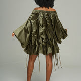 - This Dress in Olive features an off-the-shoulder design with an elasticized neckline, long sleeves with cinched cuffs, and a layered, heavily ruched construction with adjustable, self-tie drawstrings throughout that allow you to customize the length and fit of the dress.