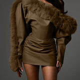 • One Shoulder, Long Sleeves, Faux-Fur Combo