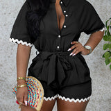 - Spread Collar, Short Sleeves, Button Front, Tied Belt