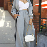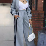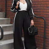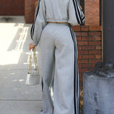 - Zip Front, Long Sleeve, Side Stripe, Wide Leg