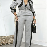 - Zip Front, Long Sleeves, Elastic Waist, Wide Leg